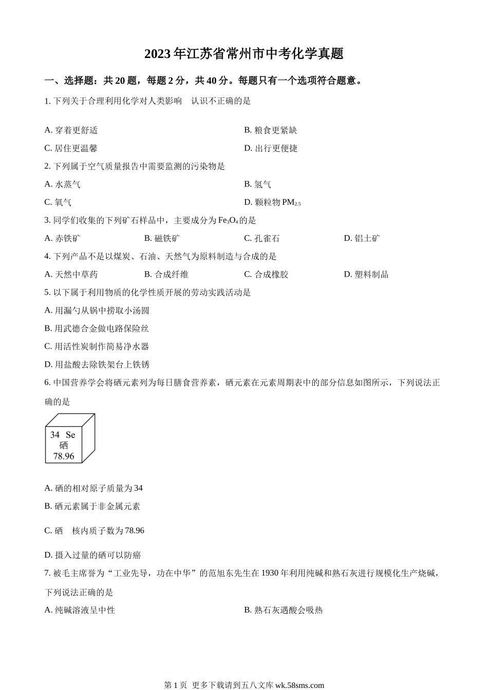 2023年江苏省常州市中考化学真题一、选择题:共20题,每题2分,共40分。每题只有一个选项符合题意。1.下列关于合理利用化学对人类影响的认识不正确的是A.穿着更舒适B.粮食更紧缺C.居住更温馨D.出行更便捷2.下列属...