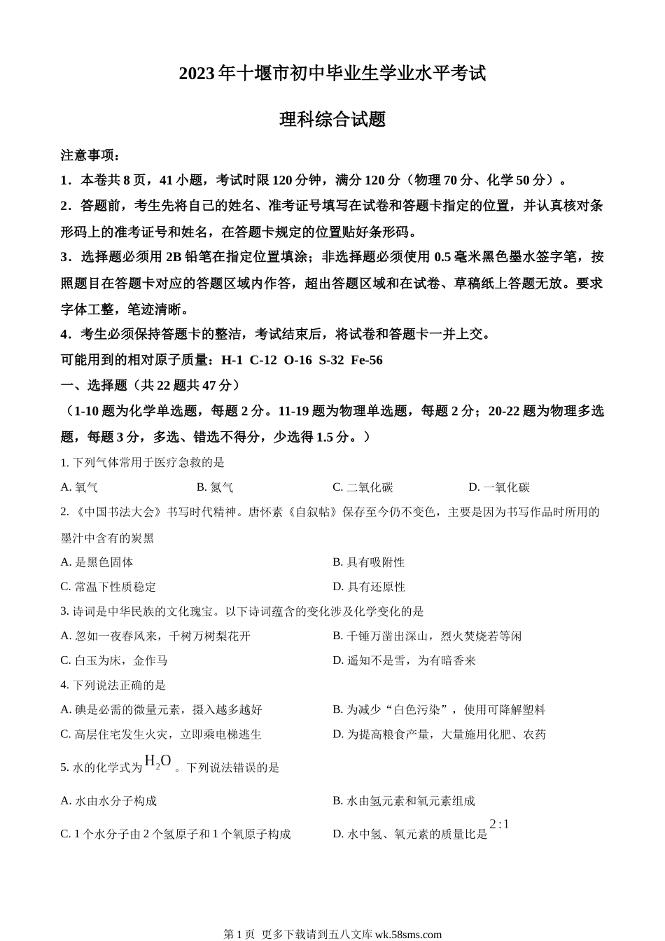 2023年十堰市初中毕业生学业水平考试理科综合试题注意事项:1.本卷共8页,41小题,考试时限120分钟,满分120分(物理70分、化学50分)。2.答题前,考生先将自己的姓名、准考证号填写在试卷和答题卡指定的位置,...
