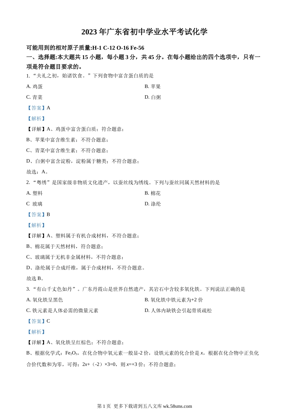 2023年广东省初中学业水平考试化学可能用到的相对原子质量:H-1C-12O-16Fe-56一、选择题:本大题共15小题,每小题3分,共45分。在每小题给出的四个选项中,只有一项是符合题目要求的。1.“夫礼之初,始诸饮食。”下...