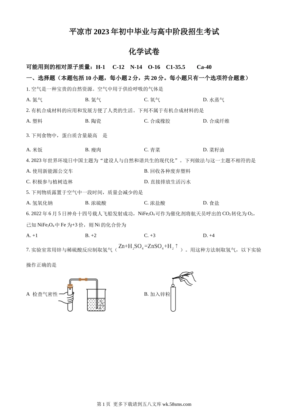 平凉市2023年初中毕业与高中阶段招生考试化学试卷可能用到的相对原子质量:H-1C-12N-14O-16C1-35.5Ca-40一、选择题(本题包括10小题,每小题2分,共20分。每小题只有一个选项符合题意)1.空气是一种宝贵的自然资...