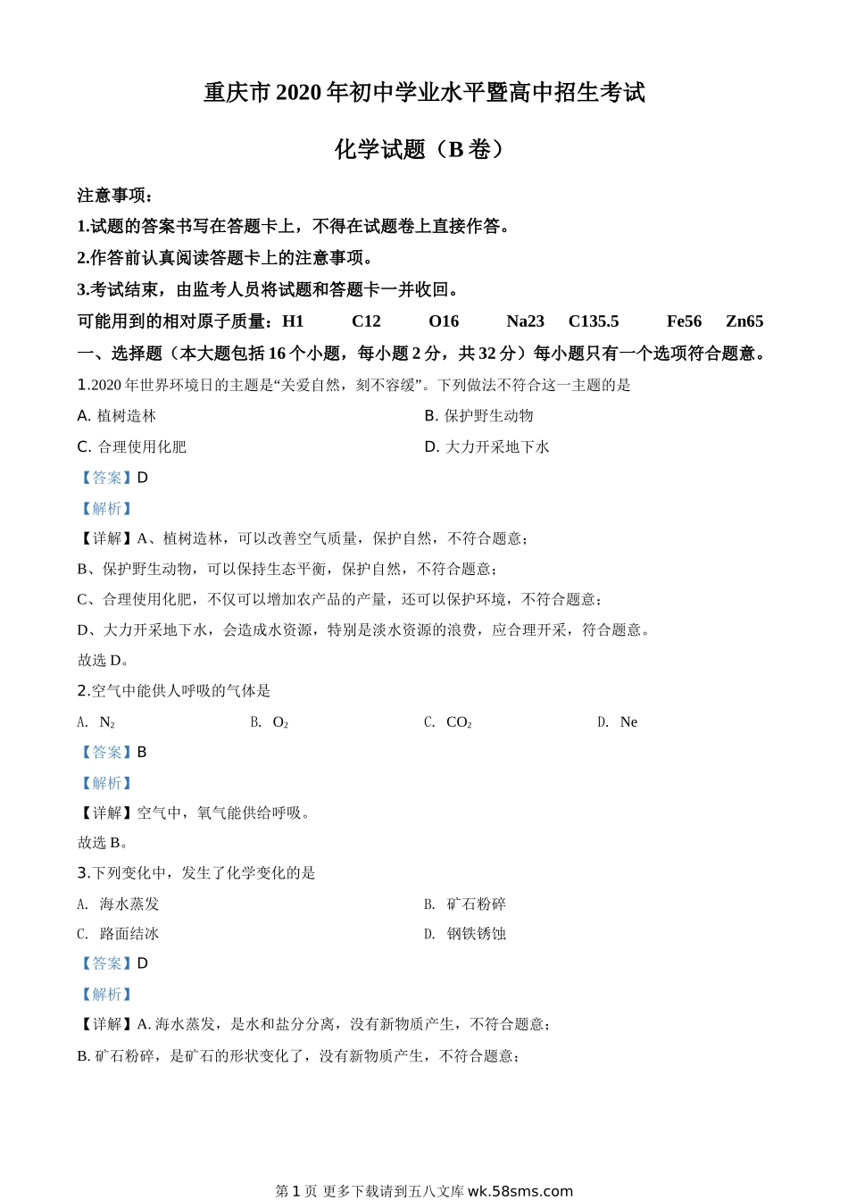 重庆市2020年初中学业水平暨高中招生考试化学试题(B卷)注意事项:1.试题的答案书写在答题卡上,不得在试题卷上直接作答。2.作答前认真阅读答题卡上的注意事项。3.考试结束,由监考人员将试题和答题卡一并收回。...