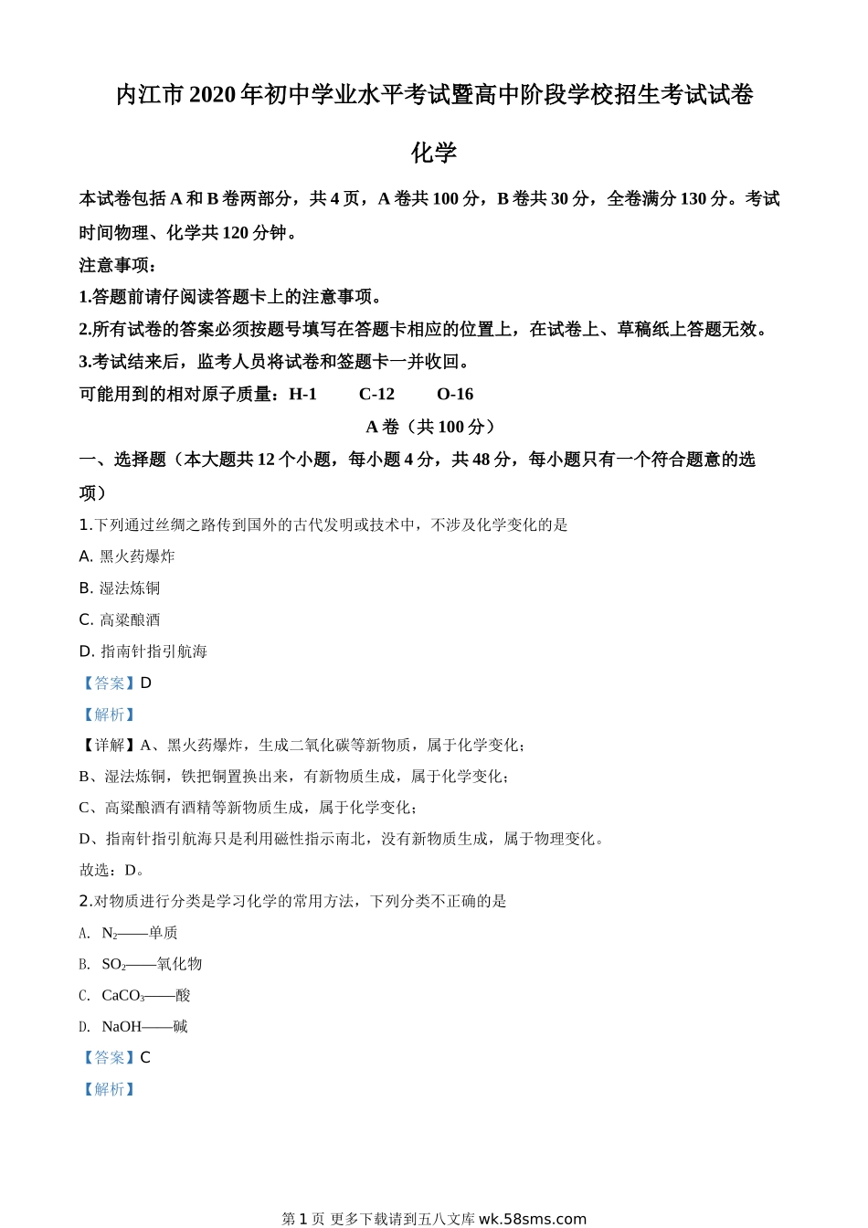 内江市2020年初中学业水平考试暨高中阶段学校招生考试试卷化学本试卷包括A和B卷两部分,共4页,A卷共100分,B卷共30分,全卷满分130分。考试时间物理、化学共120分钟。注意事项:1.答题前请仔阅读答题卡上的注意...
