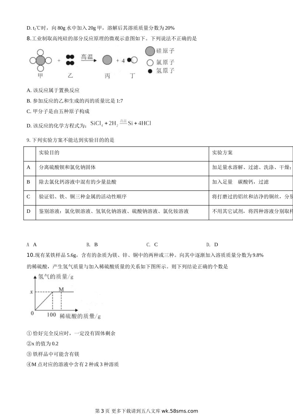 孝感市2020年高中阶段学校招生考试化学可能用到的相对原子质量:H-1C-12N-14O-16Na-23Mg-24Si-28P-31S-32Cl-35.5Fe-56Zn-65一、选择题(本题共10小题,每小题给出的A、B、C、D四个选项中只有一个正确答案。每小题...