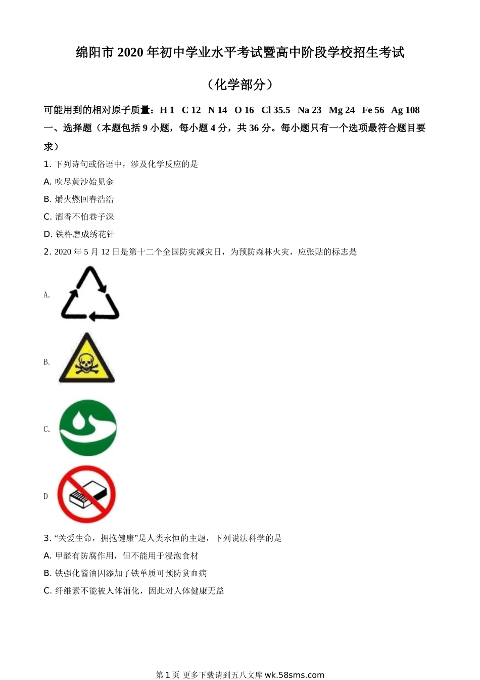 四川省绵阳市2020年中考化学试题(原卷版).doc_第1页