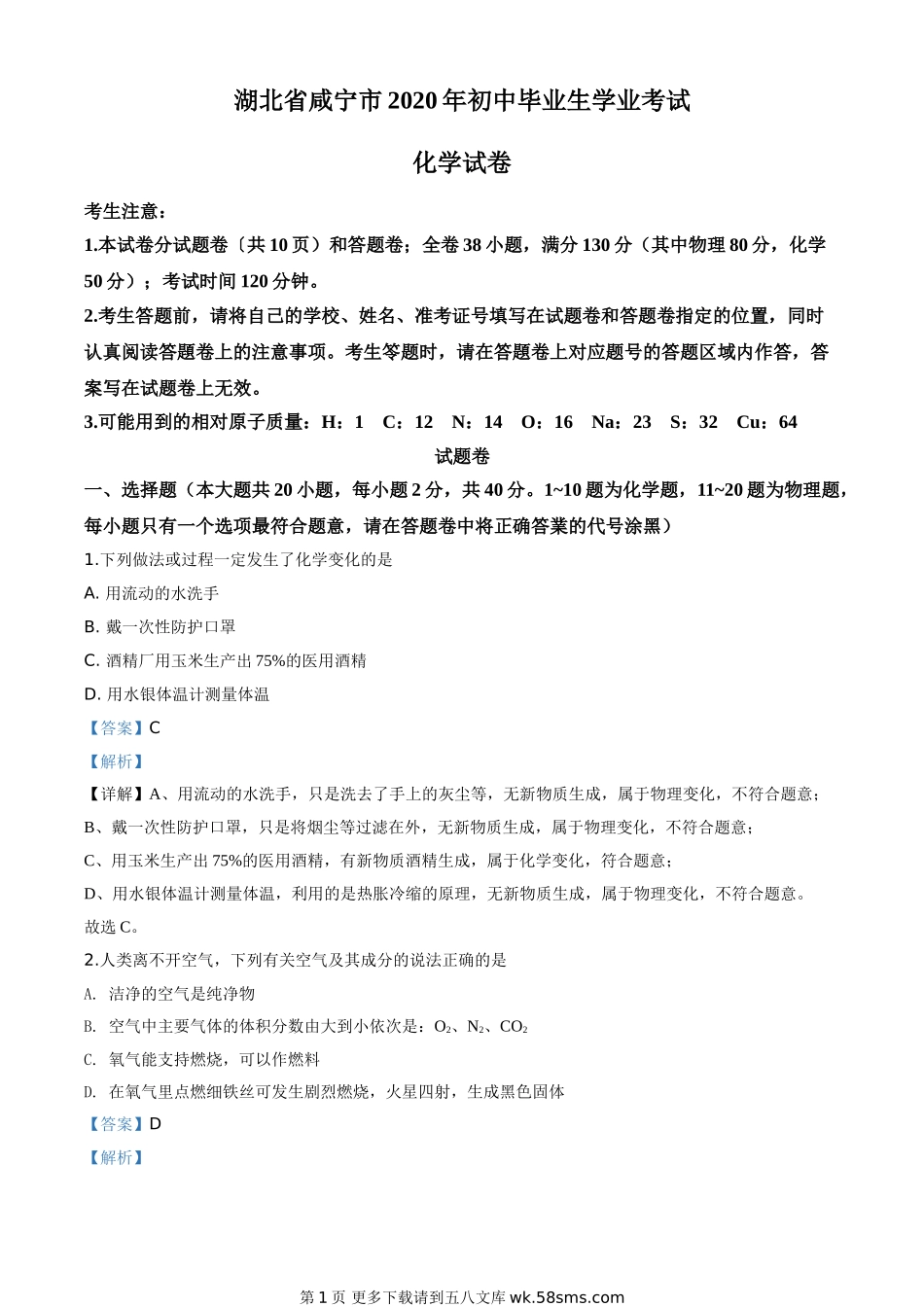 湖北省咸宁市2020年初中毕业生学业考试化学试卷考生注意:1.本试卷分试题卷〔共10页)和答题卷;全卷38小题,满分130分(其中物理80分,化学50分);考试时间120分钟。2.考生答题前,请将自己的学校、姓名、准考...