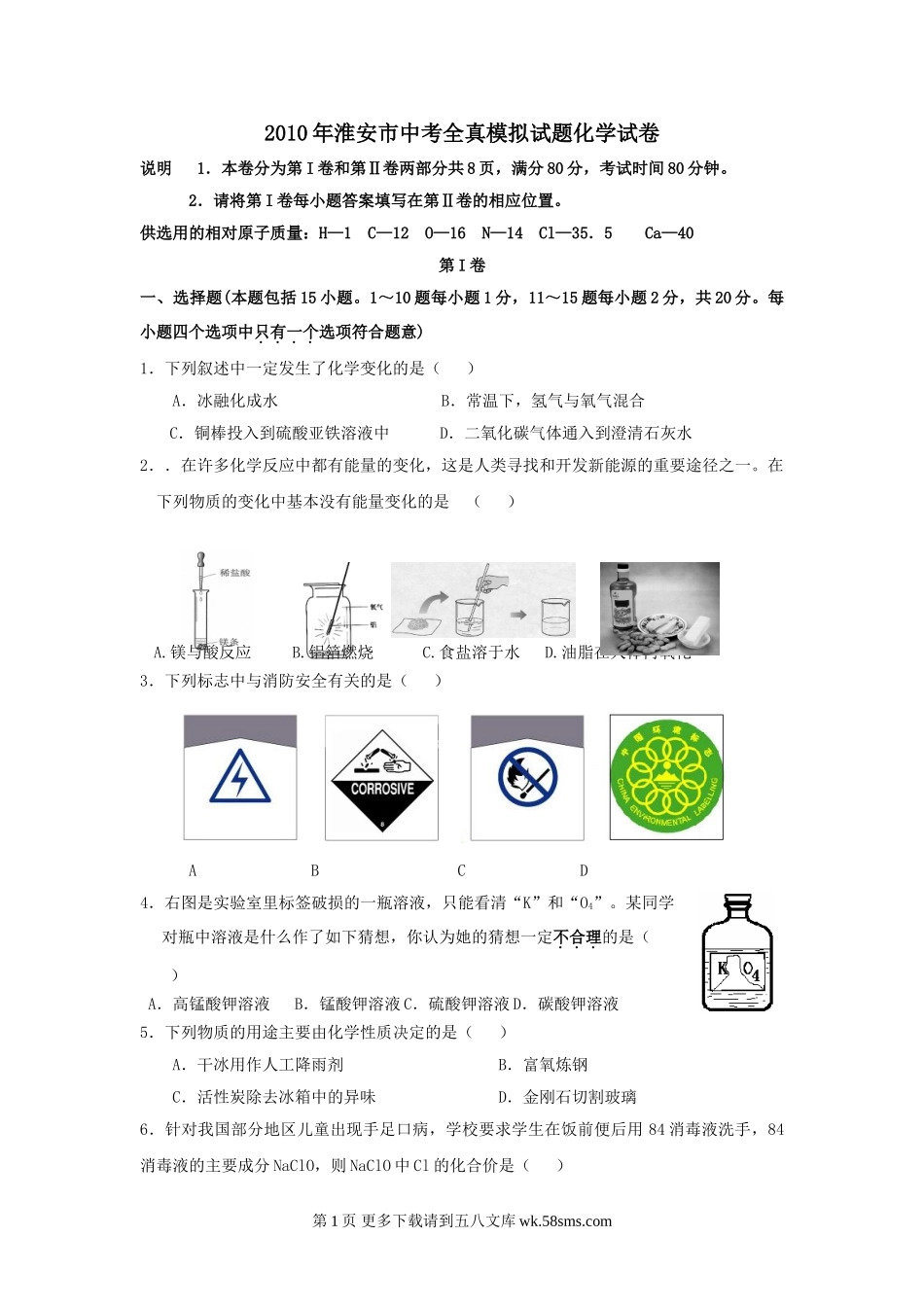 2010年淮安市中考全真模拟试题化学试卷说明1.本卷分为第I卷和第Ⅱ卷两部分共8页,满分80分,考试时间80分钟。2.请将第I卷每小题答案填写在第Ⅱ卷的相应位置。供选用的相对原子质量:H—1C—12O—16N—14Cl—35...