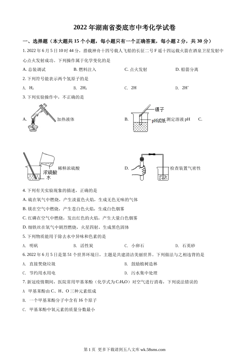 2022年湖南省娄底市中考化学试卷一、选择题(本大题共15个小题,每小题只有一个正确答案,每小题2分,共30分)1.2022年6月5日10时44分,搭载神舟十四号载人飞船的长征二号F遥十四运载火箭在酒泉卫星发射中心点火...