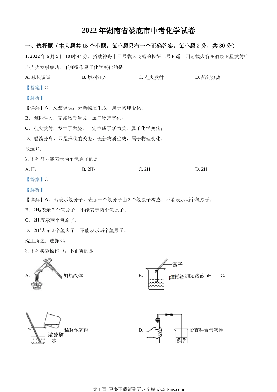 2022年湖南省娄底市中考化学试卷一、选择题(本大题共15个小题,每小题只有一个正确答案,每小题2分,共30分)1.2022年6月5日10时44分,搭载神舟十四号载人飞船的长征二号F遥十四运载火箭在酒泉卫星发射中心点火...