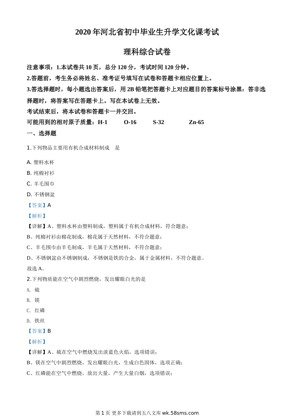 2020年河北省初中毕业生升学文化课考试理科综合试卷注意事项:1.本试卷共10页,总分120分,考试时间120分钟。2.答题前,考生务必将姓名、准考证号填写在试卷和答题卡相应位置上。3.答选择题时,每小题选出答案后...