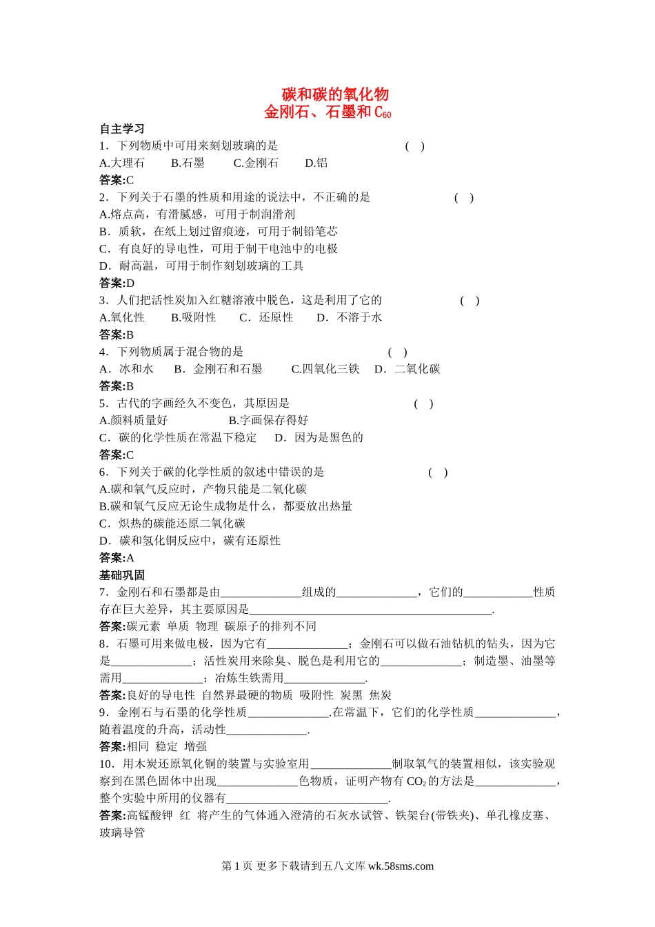 碳和碳的氧化物金刚石、石墨和C60自主学习1.下列物质中可用来刻划玻璃的是()A.大理石B.石墨C.金刚石D.铝答案:C2.下列关于石墨的性质和用途的说法中,不正确的是()A.熔点高,有滑腻感,可用于制润滑剂B.质软,...