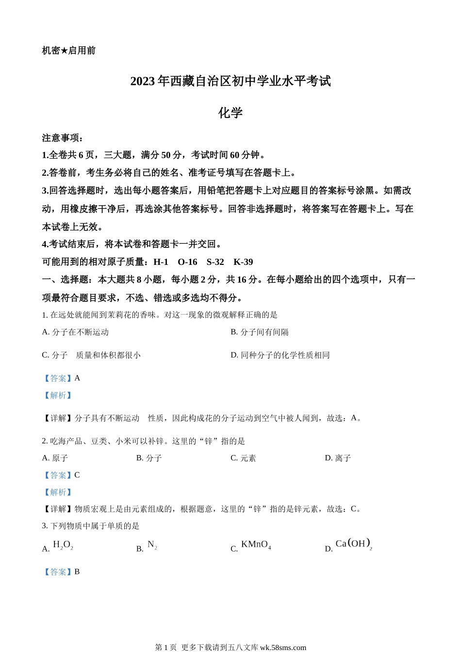 机密★启用前2023年西藏自治区初中学业水平考试化学注意事项:1.全卷共6页,三大题,满分50分,考试时间60分钟。2.答卷前,考生务必将自己的姓名、准考证号填写在答题卡上。3.回答选择题时,选出每小题答案后,用...