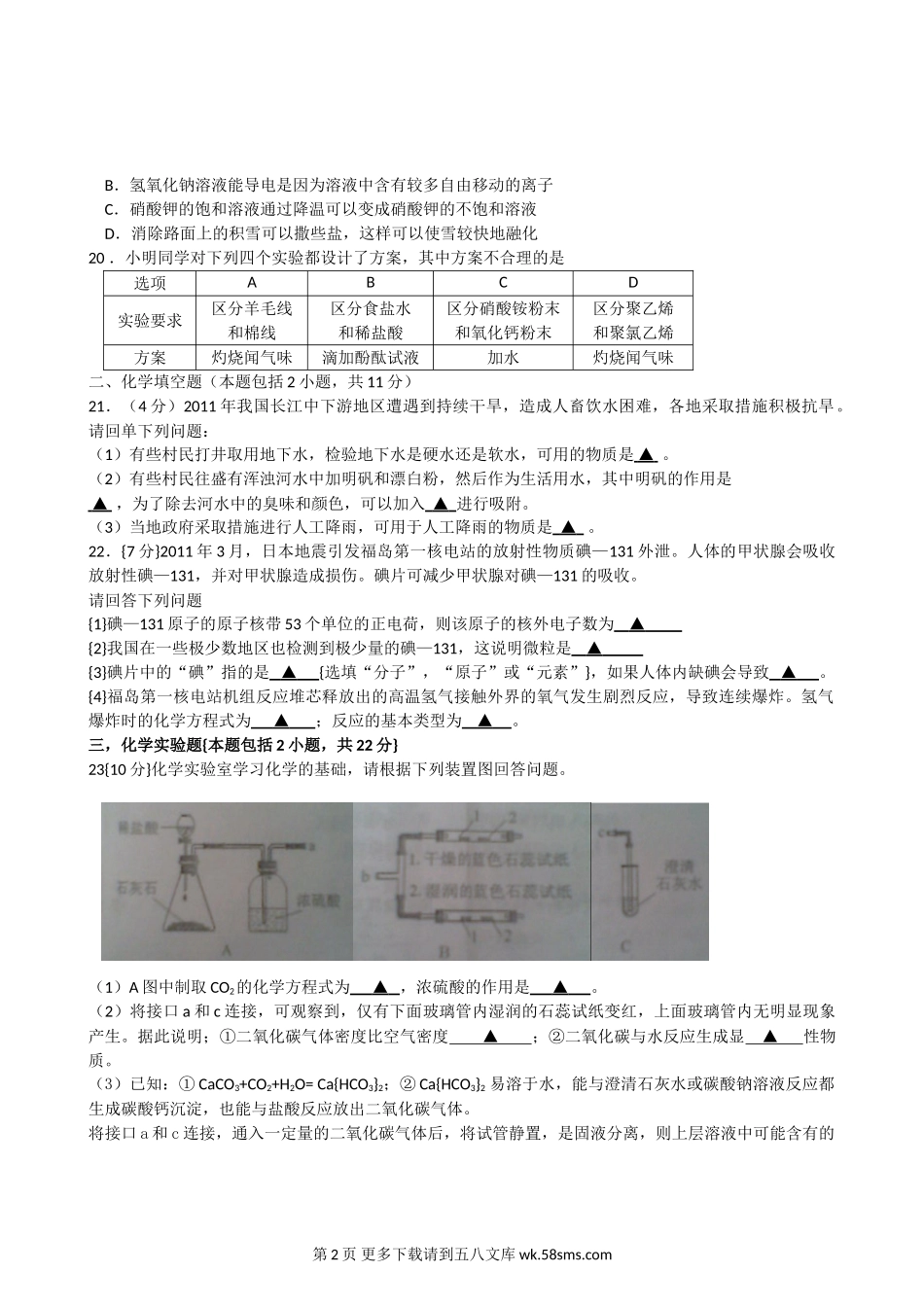 2011年江苏省徐州市中考化学试题可能用到的相对分子质量:H—1C—12O—16一、选择题(每小题只有一个选项符合题意;每小题2分。共20分)11..2011年,我市“创模”工作取得重大突破,国家环保部授予徐州市“国家...