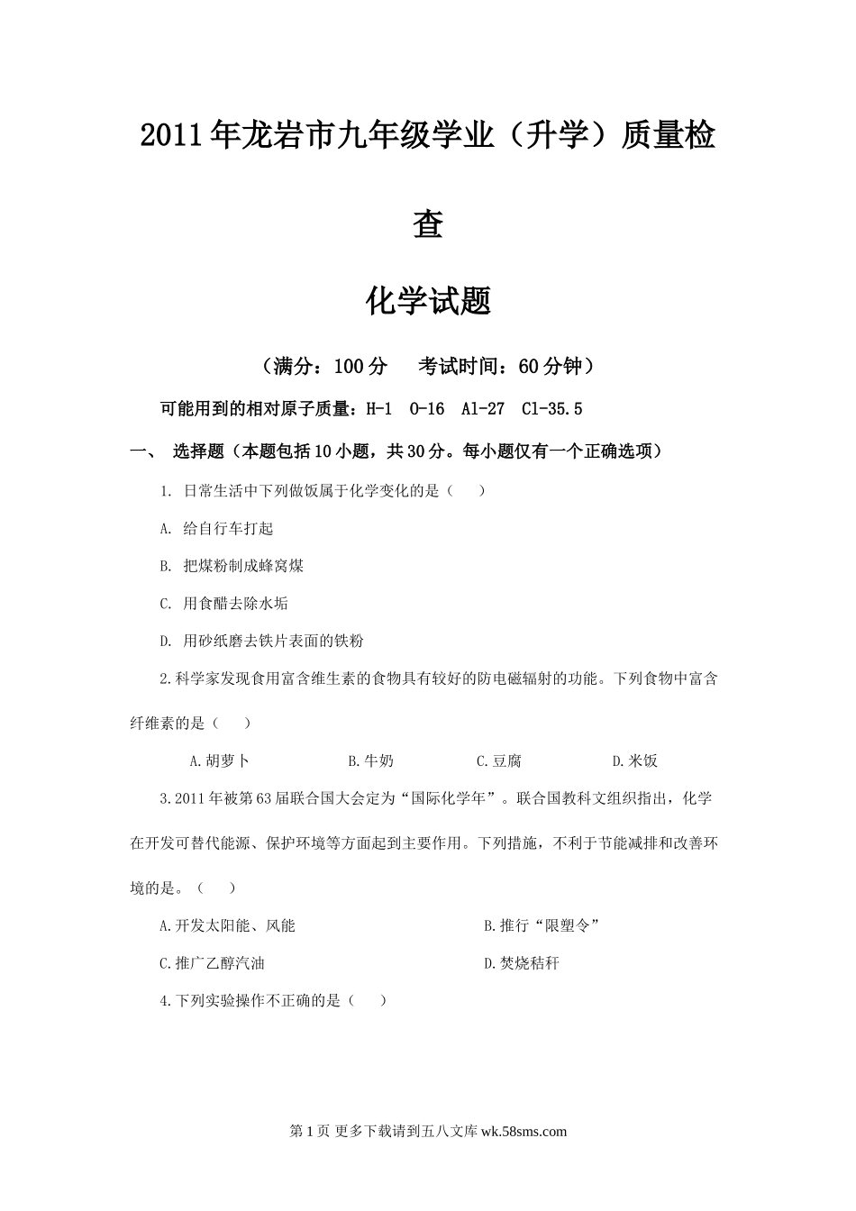 2011年龙岩市九年级学业(升学)质量检查化学试题(满分:100分考试时间:60分钟)可能用到的相对原子质量:H-1O-16Al-27Cl-35.5一、选择题(本题包括10小题,共30分。每小题仅有一个正确选项)1.日常生活中下列...