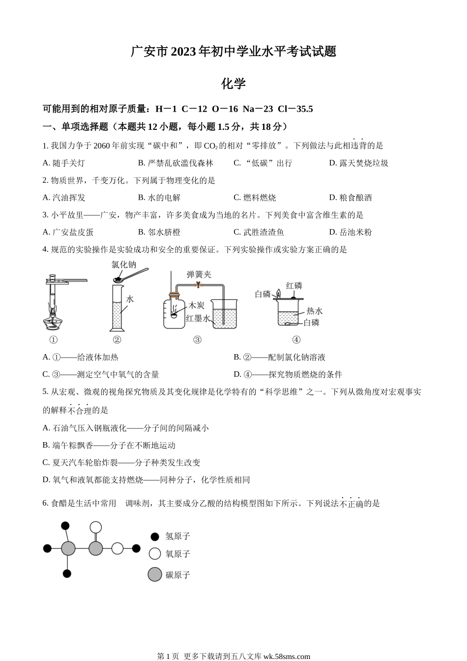 广安市2023年初中学业水平考试试题化学可能用到的相对原子质量:H-1C-12O-16Na-23Cl-35.5一、单项选择题(本题共12小题,每小题1.5分,共18分)1.我国力争于2060年前实现“碳中和”,即CO2的相对“零排放”...