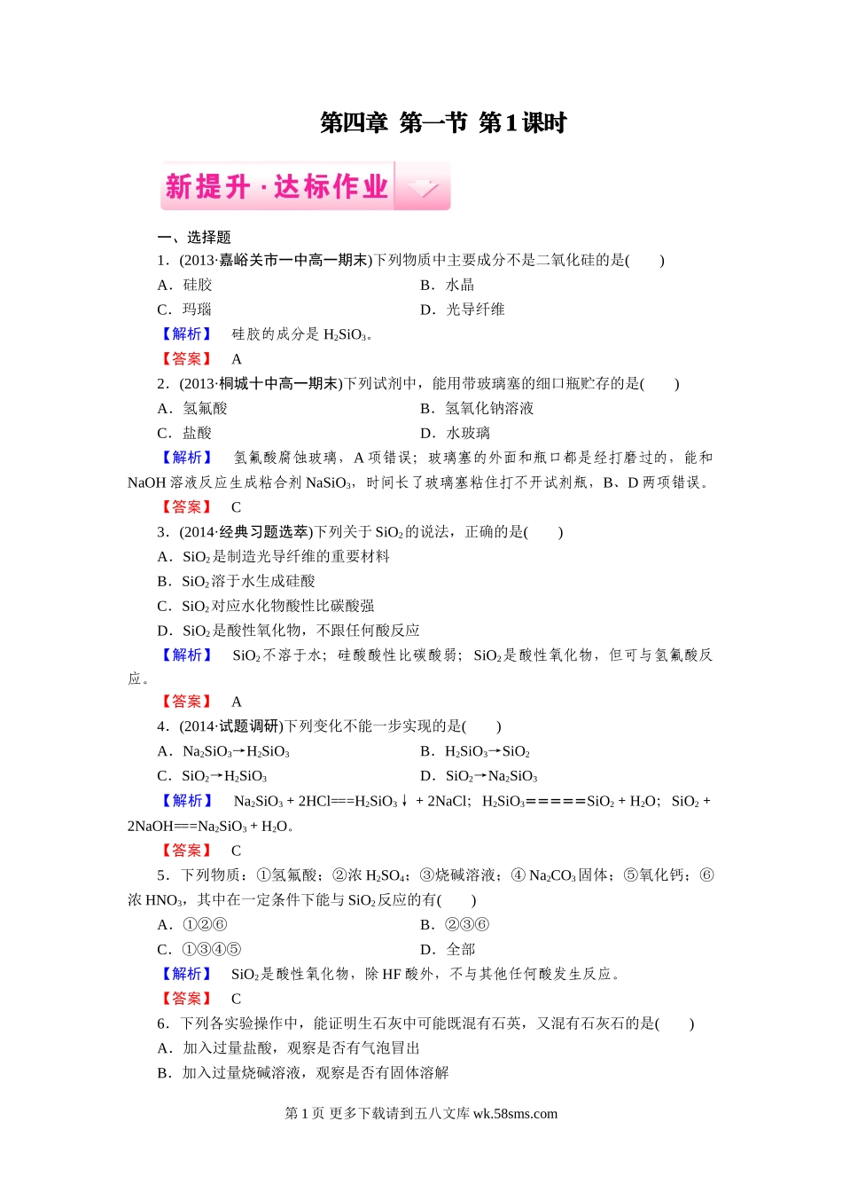 第四章第一节第1课时一、选择题1.(2013·嘉峪关市一中高一期末)下列物质中主要成分不是二氧化硅的是()A.硅胶B.水晶C.玛瑙D.光导纤维【解析】硅胶的成分是H2SiO3。【答案】A2.(2013·桐城十中高一期末)下列...