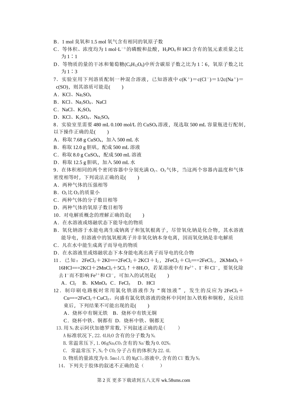 北大附中河南分校高一上第一次月考化学试卷及答案.doc_第2页