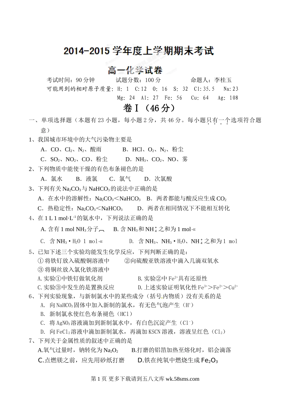 考试时间:90分钟试题分数:100分命题人:李桂玉可能用到的相对原子质量:H:1C:12O:16S:32Cl:35.5Na:23Mg:24Al:27Fe:56Cu:64Ag:108卷Ⅰ(46分)一、单项选择题(本题有23小题,每小题2分,共46分。每小题...