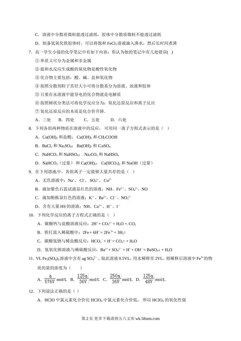 郸城一高高一上学期第三次月考化学试卷及答案.doc_第2页