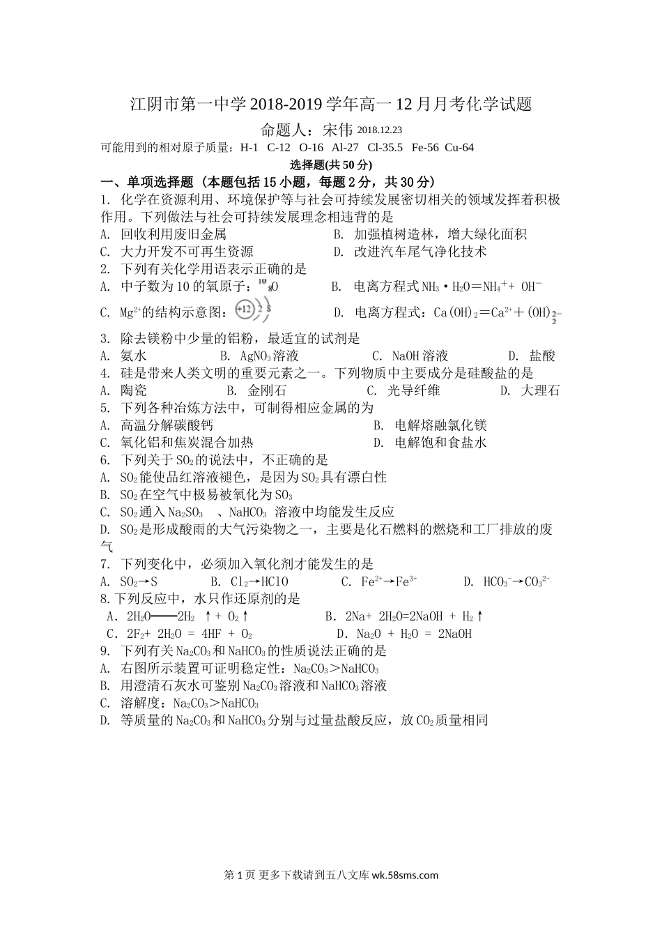 江阴市第一中学2018-2019学年高一12月月考化学试题命题人:宋伟2018.12.23可能用到的相对原子质量:H-1C-12O-16Al-27Cl-35.5Fe-56Cu-64选择题(共50分)一、单项选择题(本题包括15小题,每题2分,共30分)1.化学在资...