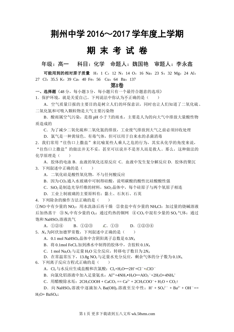 荆州中学2016~2017学年度上学期期末考试卷年级:高一科目:化学命题人:魏国艳审题人:李永鑫可能用到的相对原子质量H:1C:12N:14O:16Na:23S:32Mg:24Al:27Cl:35.5K:39Ca:40Fe:56Cu:64Ba:137第I卷一...