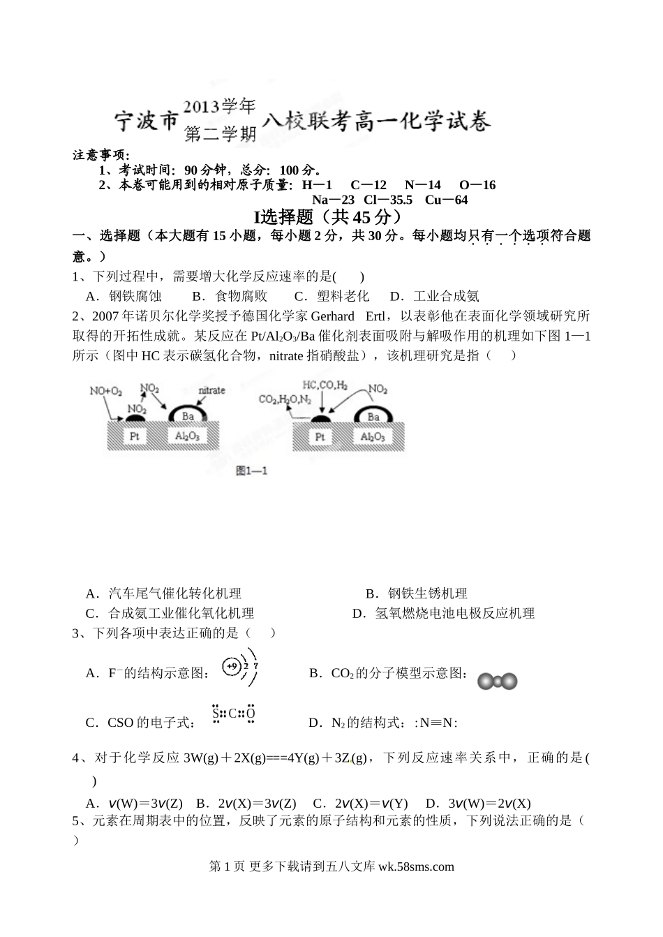 宁波市第二学期高一化学期末试题及答案.doc_第1页