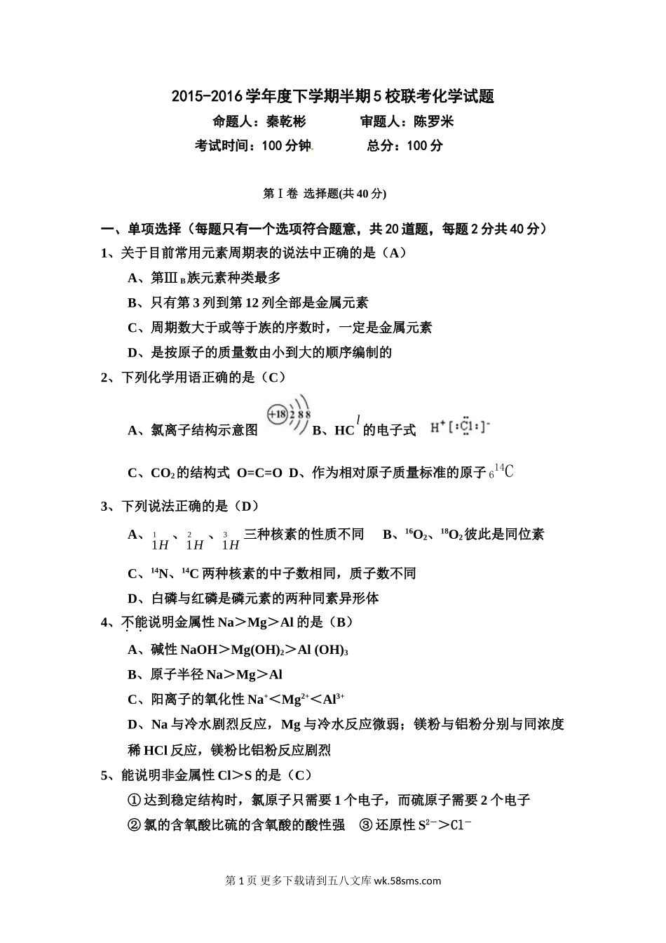 2015-2016学年度下学期半期5校联考化学试题命题人:秦乾彬审题人:陈罗米考试时间:100分钟总分:100分第Ⅰ卷选择题(共40分)[来源:Zxxk.Com]一、单项选择(每题只有一个选项符合题意,共20道题,每题2分共40分)1...