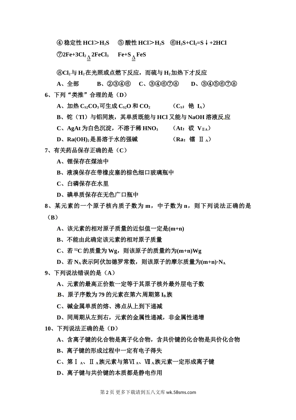 彭州五校联考高一下学期化学期中试题及答案.doc_第2页