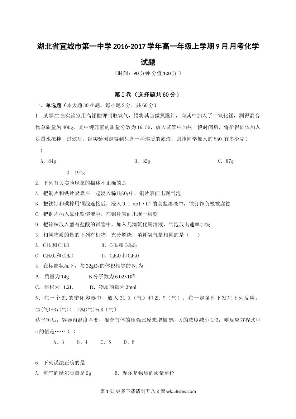 湖北省宜城市第一中学2016-2017学年高一年级上学期9月月考化学试题(时间:90分钟分值100分)第I卷(选择题共60分)一、单选题(本大题30小题,每小题2分,共60分)1.某学生在实验室用高锰酸钾制取氧气,错将其...