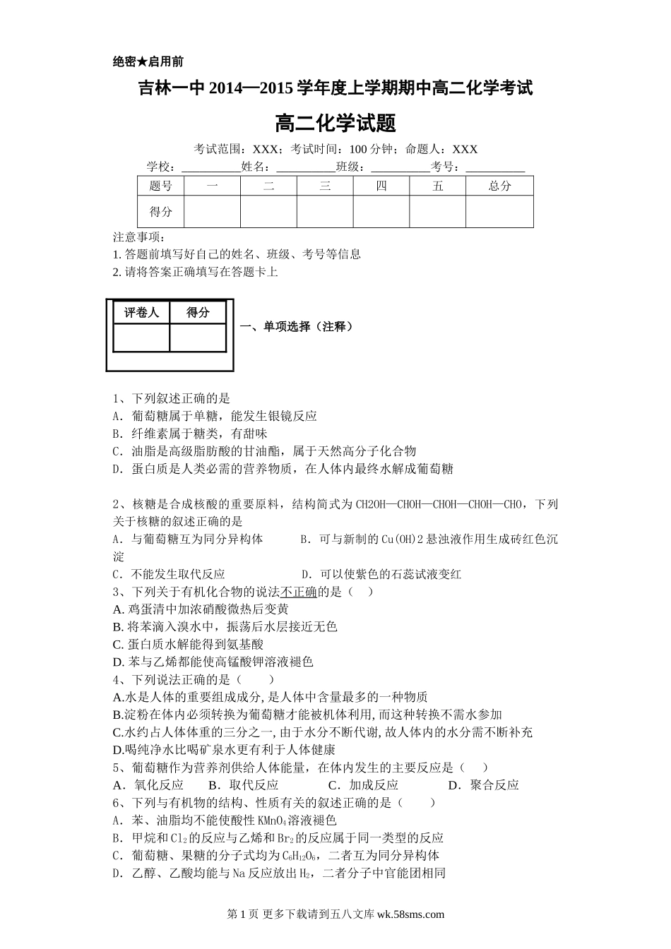 绝密★启用前吉林一中2014—2015学年度上学期期中高二化学考试高二化学试题考试范围:XXX;考试时间:100分钟;命题人:XXX学校:__________姓名:__________班级:__________考号:__________题号一二三四五总分...