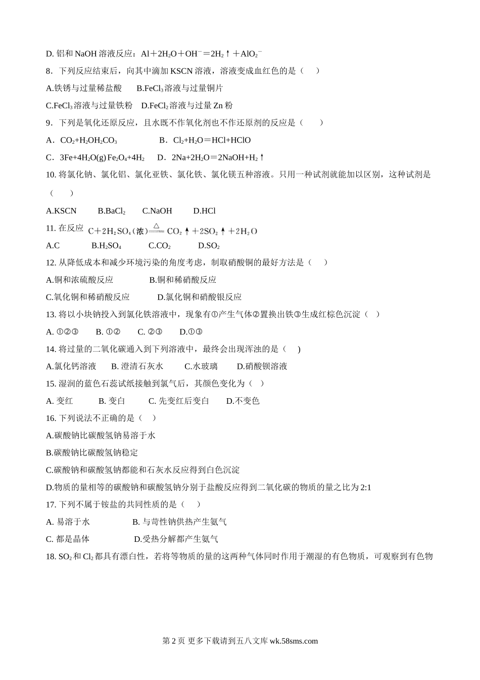 高二学年期中考试化学(文科)试题可能用到的相对原子质量:H:1C:12O:16S:32Na:23K:39Ca:40Fe:56Cl:35.5第Ⅰ卷(选择题共60分)一、选择题(本题包括20小题,每小题3分。每小题只有一个选项符合题意。)1.84...