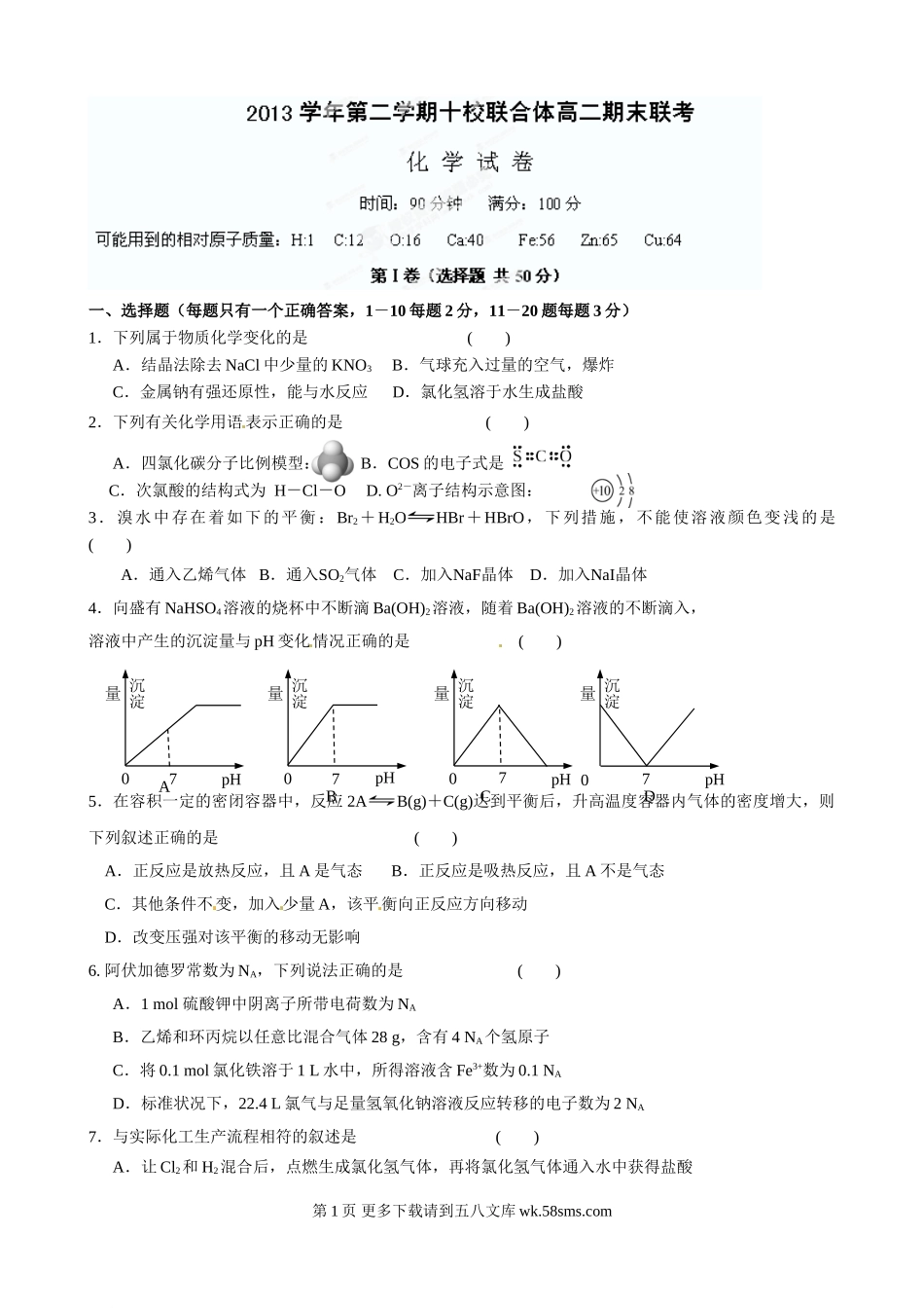 温州十校联考高二下学期期末化学试题及答案.doc_第1页