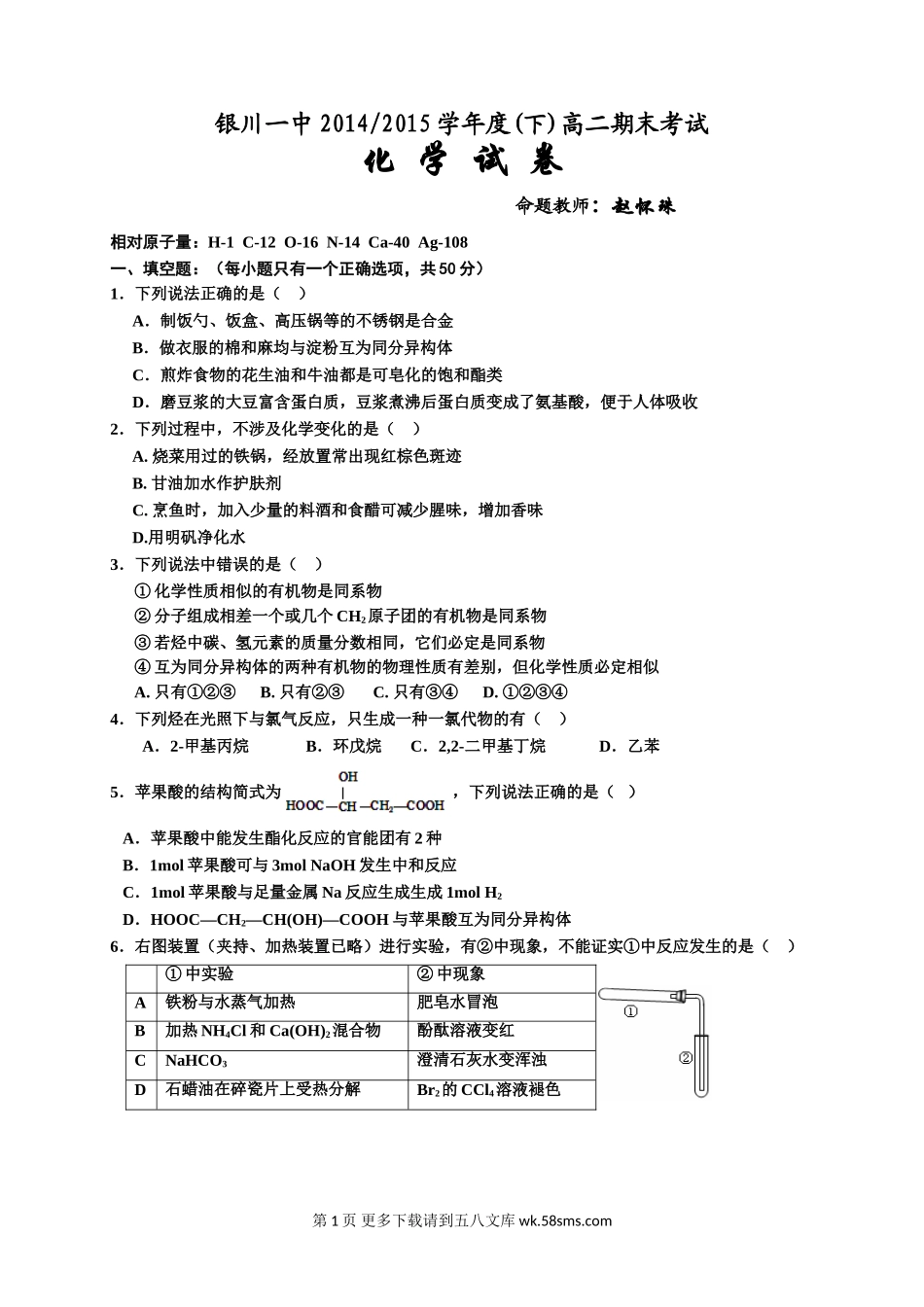 银川一中高二下化学期末试卷及答案.doc_第1页
