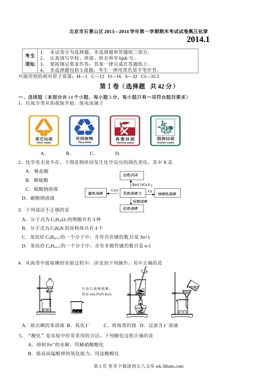 北京市石景山区2013—2014学年第一学期期末考试试卷高三化学2014.1考生须知1.本试卷分为选择题、非选择题和答题纸三部分。2.认真填写学校、班级、姓名和学bjsh号。3.要按规定要求作答,答案一律完成在答题纸上...
