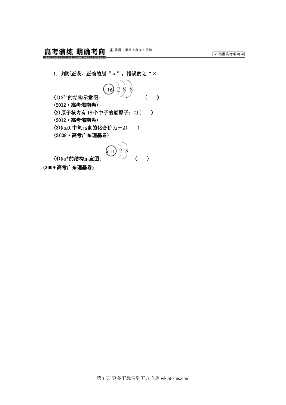 1.判断正误,正确的划“√”,错误的划“×”(1)S2-的结构示意图:()(2012·高考海南卷)(2)原子核内有18个中子的氯原子:Cl()(2012·高考海南卷)(3)Na2O2中氧元素的化合价为-2()(2008·高考广东理基卷)(4)Na...