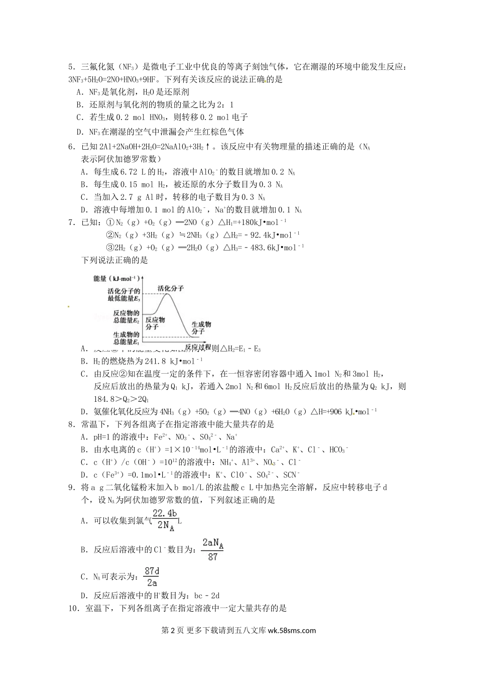 福州闽清高中第一学期高三化学期中考试试题及答案.doc_第2页