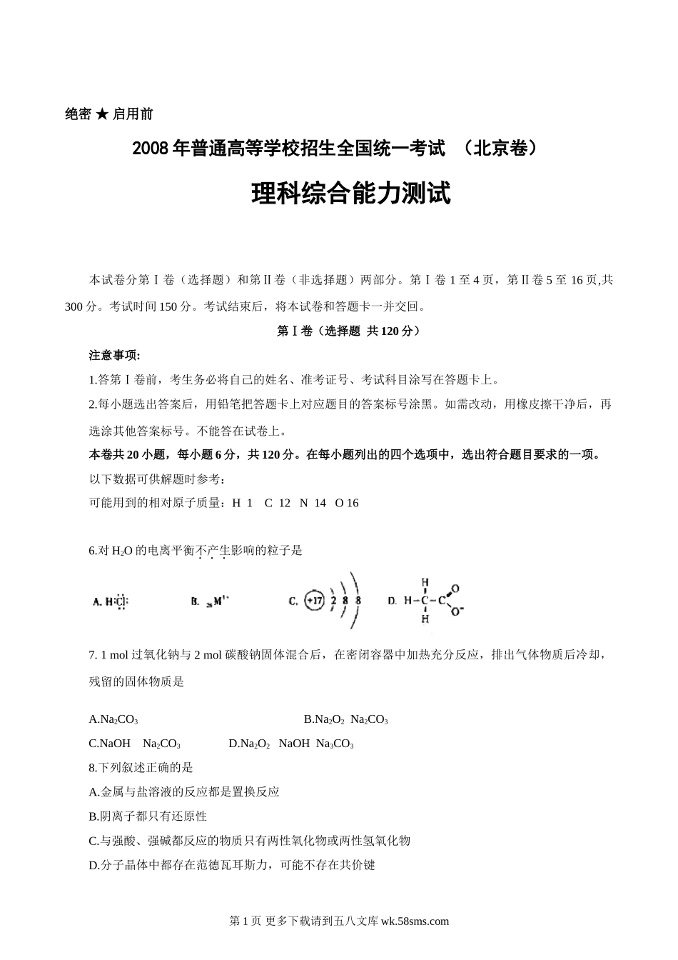 绝密★启用前2008年普通高等学校招生全国统一考试(北京卷)理科综合能力测试本试卷分第Ⅰ卷(选择题)和第Ⅱ卷(非选择题)两部分。第Ⅰ卷1至4页,第Ⅱ卷5至16页,共300分。考试时间150分。考试结束后,将本试卷...