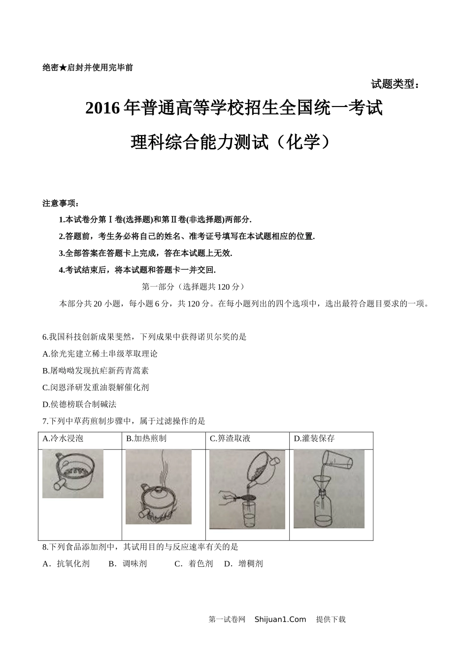 绝密★启封并使用完毕前试题类型:2016年普通高等学校招生全国统一考试理科综合能力测试(化学)注意事项:1.本试卷分第Ⅰ卷(选择题)和第Ⅱ卷(非选择题)两部分.2.答题前,考生务必将自己的姓名、准考证号填写在本...