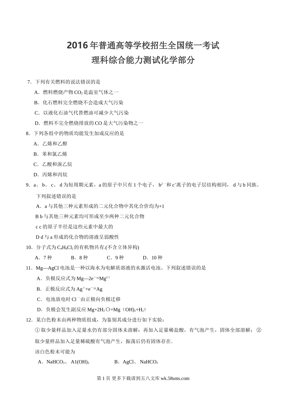 2016年普通高等学校招生全国统一考试理科综合能力测试化学部分7.下列有关燃料的说法错误的是A.燃料燃烧产物CO2是温室气体之一B.化石燃料完全燃烧不会造成大气污染C.以液化石油气代替燃油可减少大气污染D.燃...