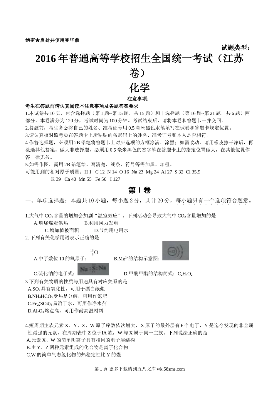 绝密★启封并使用完毕前试题类型:2016年普通高等学校招生全国统一考试(江苏卷)化学注意事项:考生在答题前请认真阅读本注意事项及各题答案要求1.本试卷共10页,包含选择题(第1题~第15题,共15题)和非选择题...