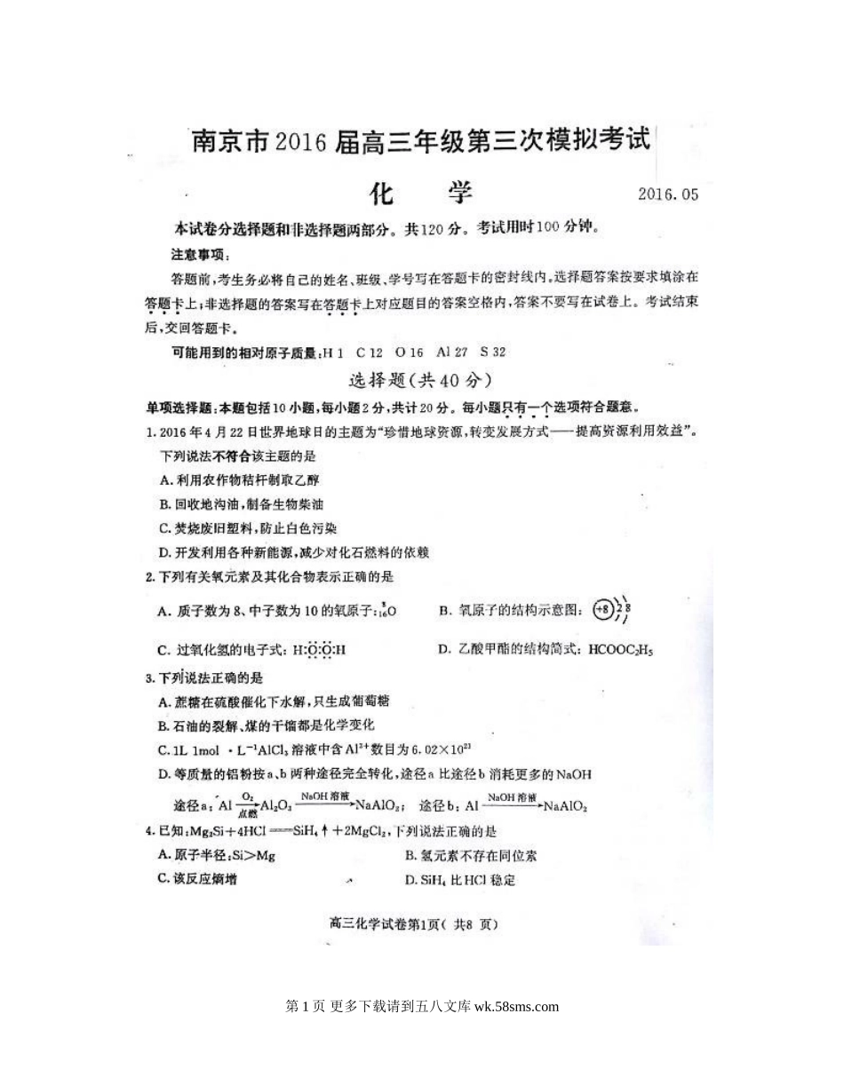2016年南京市高三三模化学试题及答案.doc_第1页