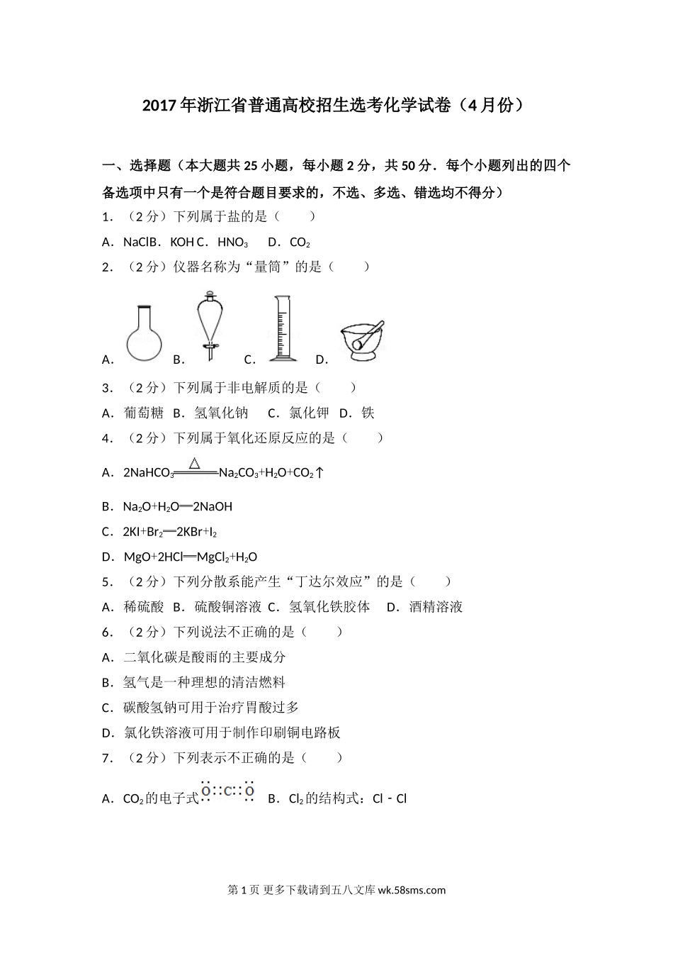2017年4月浙江省高中化学学考选考试题与答案.doc_第2页