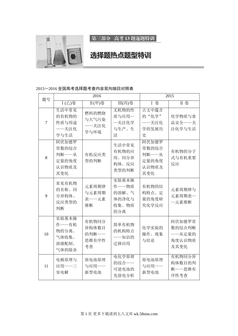 2015~2016全国高考选择题考查内容双向细目对照表题号20162015Ⅰ(乙)卷Ⅱ(甲)卷Ⅲ(丙)卷Ⅰ卷Ⅱ卷7生活中常见的有机物的性质与用途——关注化学与生活燃料的燃烧与大气污染——关注化学与环境无机物的性质与应用—...