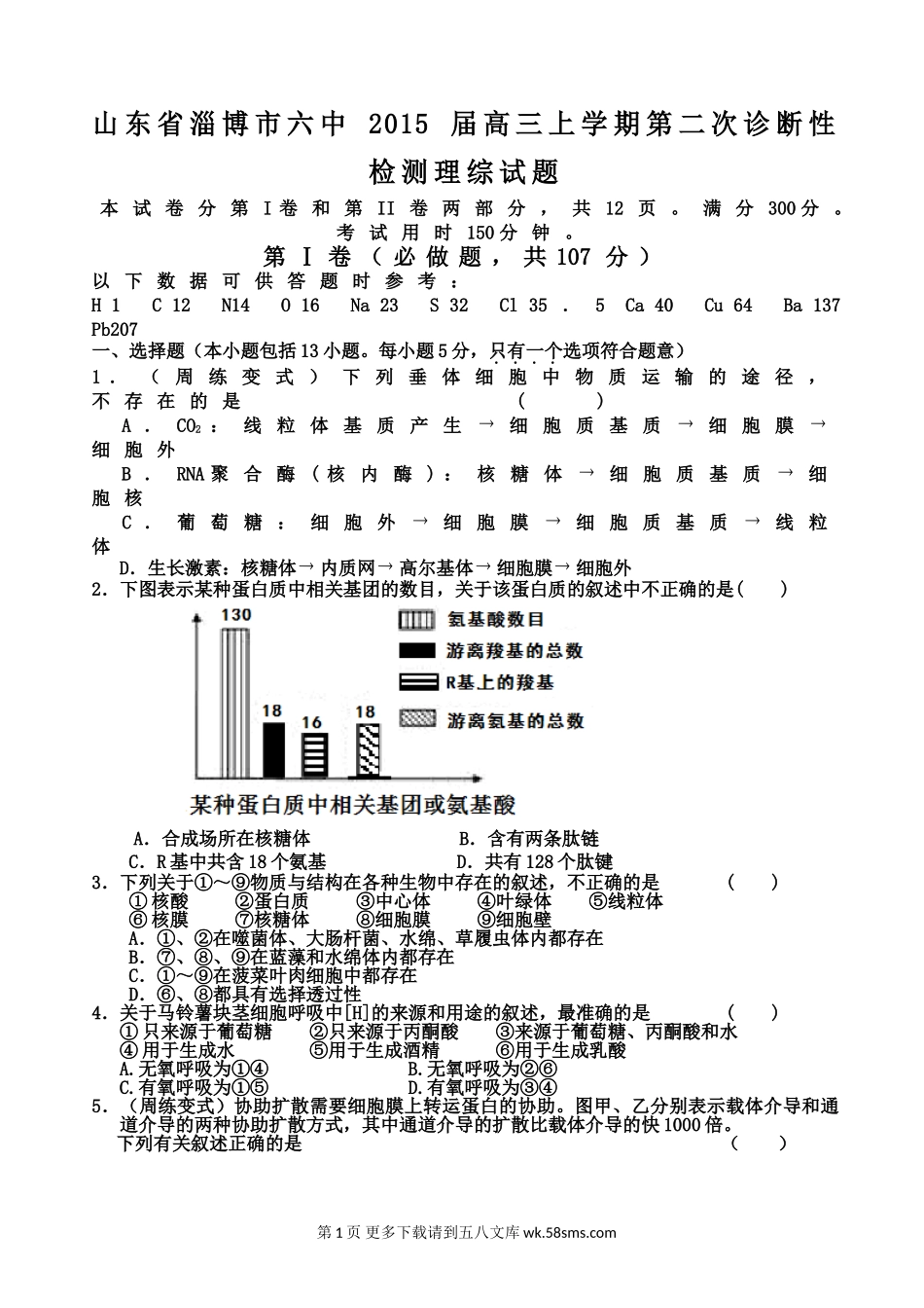 山东省淄博市六中2015届高三上学期第二次诊断性检测理综试题本试卷分第I卷和第II卷两部分,共12页。满分300分。考试用时150分钟。第Ⅰ卷(必做题,共107分)以下数据可供答题时参考:H1C12N14O16Na23S32Cl35.5Ca...