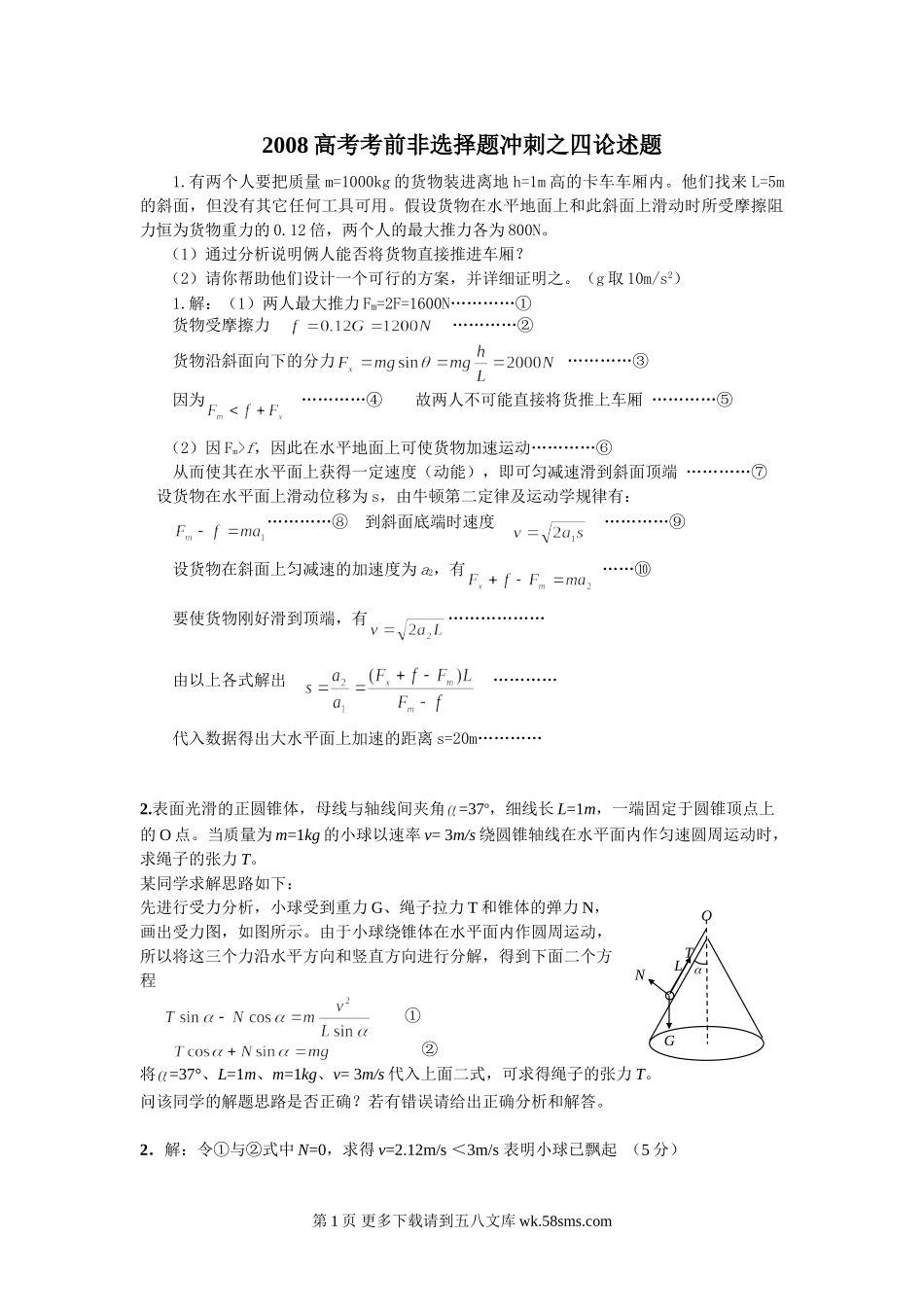 2008高考考前非选择题冲刺之四论述题1.有两个人要把质量m=1000kg的货物装进离地h=1m高的卡车车厢内。他们找来L=5m的斜面,但没有其它任何工具可用。假设货物在水平地面上和此斜面上滑动时所受摩擦阻力恒为货物重...
