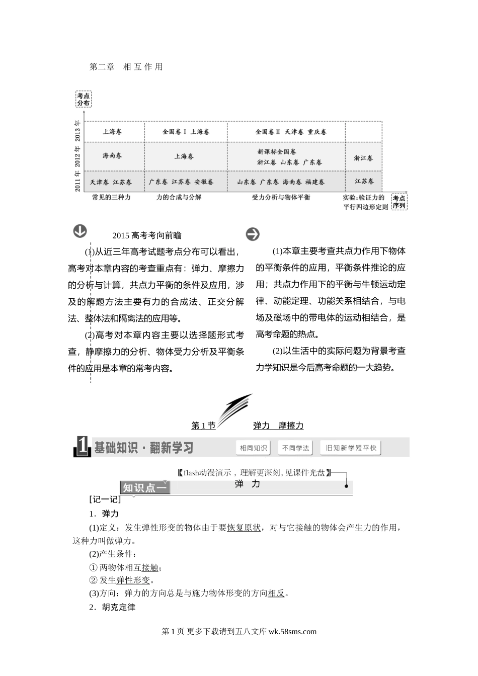 第二章相互作用2015高考考向前瞻(1)本章主要考查共点力作用下物体的平衡条件的应用,平衡条件推论的应用;共点力作用下的平衡与牛顿运动定律、动能定理、功能关系相结合,与电场及磁场中的带电体的运动相结合,是...