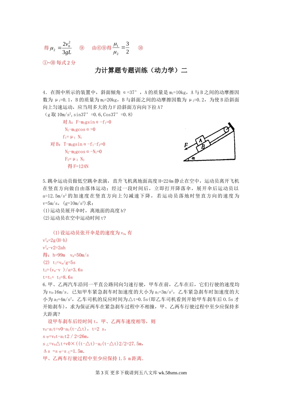 力计算题专题训练(动力学)一1.(15分)一光滑圆环固定在竖直平面内,环上套着两个小球A和B(中央有孔),A、B间由细绳连接着,它们处于如图中所示位置时恰好都能保持静止状态。此情况下,B球与环中心O处于同一...
