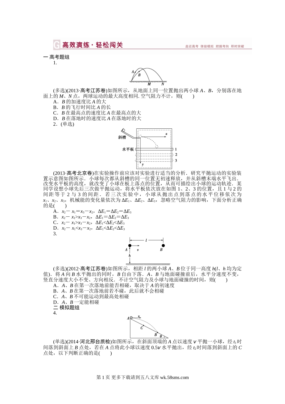 一高考题组1.(多选)(2013·高考江苏卷)如图所示,从地面上同一位置抛出两小球A、B,分别落在地面上的M、N点,两球运动的最大高度相同.空气阻力不计,则()A.B的加速度比A的大B.B的飞行时间比A的长C.B在最高点的...