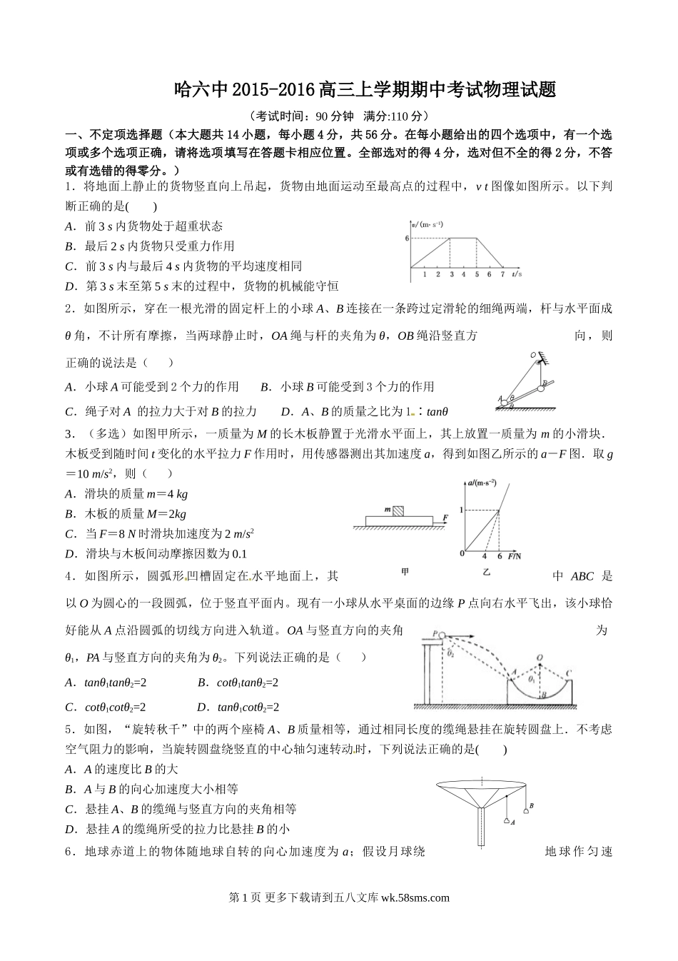 哈六中2015-2016高三上学期期中考试物理试题(考试时间:90分钟满分:110分)一、不定项选择题(本大题共14小题,每小题4分,共56分。在每小题给出的四个选项中,有一个选项或多个选项正确,请将选项填写在答题卡...