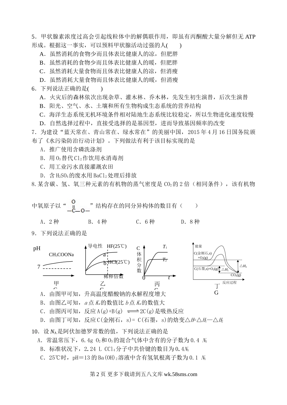 河北省“五个一名校联盟”2016届高三教学质量监测理综试卷(满分:300分,测试时间:150分钟)第Ⅰ卷(126分)可能用到的相对原子质量:H:1C:12O:16N:14S:32Na:23Fe:56Zn:65一、选择题:本大题共21小题,每小题6...
