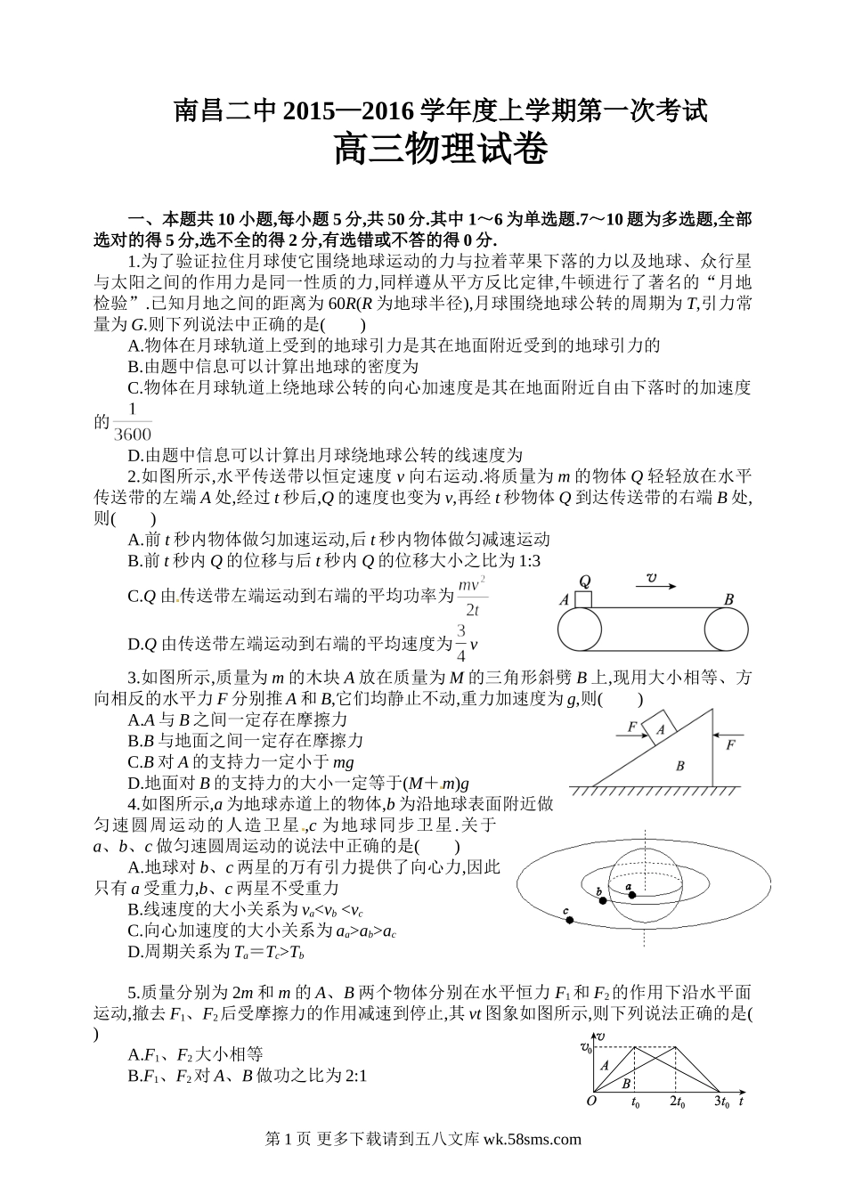 南昌二中2015—2016学年度上学期第一次考试高三物理试卷一、本题共10小题,每小题5分,共50分.其中1~6为单选题.7~10题为多选题,全部选对的得5分,选不全的得2分,有选错或不答的得0分.1.为了验证拉住月球使它围绕地...